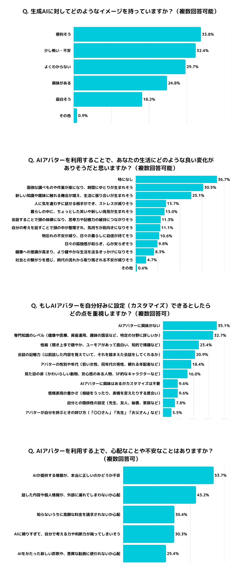 AIアバターの利用により「新しい知識や趣味に触れる機会が増え、生活に張り合いが生まれそう」(25.1%)という期待があります。また、「人に気を遣わずに話せる相手ができ、ストレスが減りそう」(13.7%)、「日々の孤独感が和らぎ、心が安らぎそう」(9.8%)といった精神的な変化も期待されています。