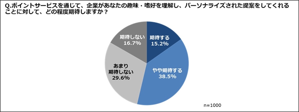 ポイントサービスを通じて趣味や嗜好を理解した上でのパーソナライズされた提案については、「やや期待する」(38.5%)が最も多く、「期待する」(15.2%)と合わせると、半数以上が前向きな姿勢を示す一方で、否定的な層も46.3%と拮抗していることが分かります。パーソナライズ提案は魅力を感じる人と不安を覚える人に分かれやすい施策といえます。