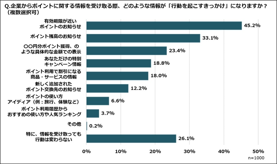 ポイントサービスで顧客の行動を促す情報は「有効期限が近いポイントのお知らせ」(45.2%)が1位であり、期限切れによる損失回避が最も強い要因であることが分かりました。