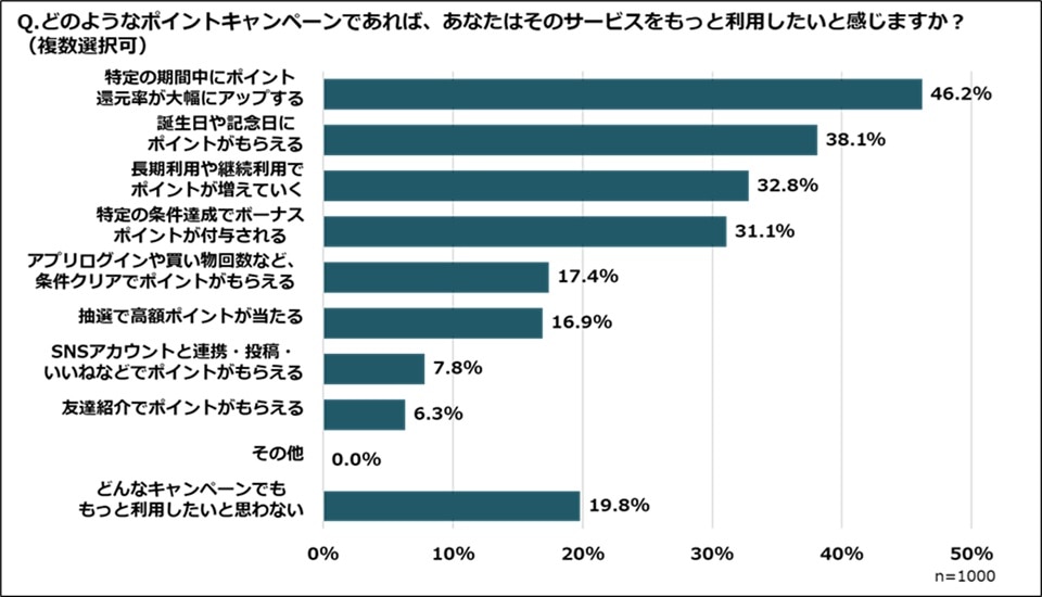 また、ポイントキャンペーンは半数以上(51.7%)の顧客の利用を喚起しており、特に「特定の期間中にポイント還元率が大幅にアップする」といった期間限定でお得感のあるキャンペーン(46.2%)が最大の利用促進要因であることが分かりました。